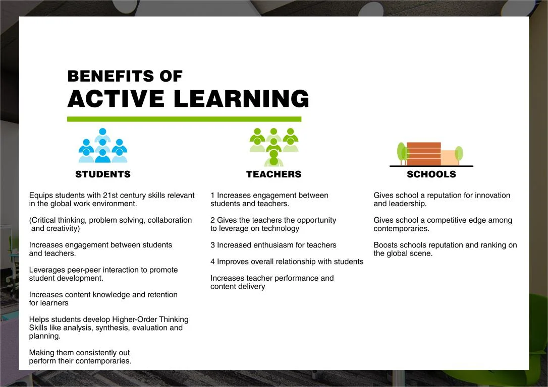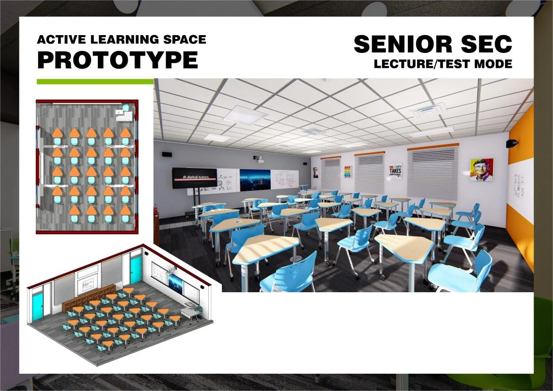 After a process of collaborative brainstorming and research, Dezyncycle came up with a solution called, “Active Learning Space”. Active learning space is an innovative education solution that helps enhance the learning experience of students as well as improve their academic performance, by facilitating pedagogy, optimizing spaces and integrating technology