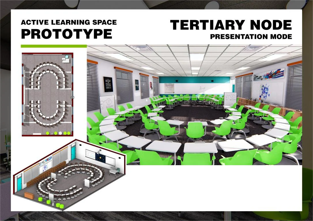 | Lecture | Test Mode Project Mode Team Mode Discussion Mode | Teacher lectern. Steelcase verb tables SmithSystem chairs Teacher lectern. Surface Finishes, Window blinds. | Mobile interactive screens. Public address sound systems. Projector and screen. Internet networking |